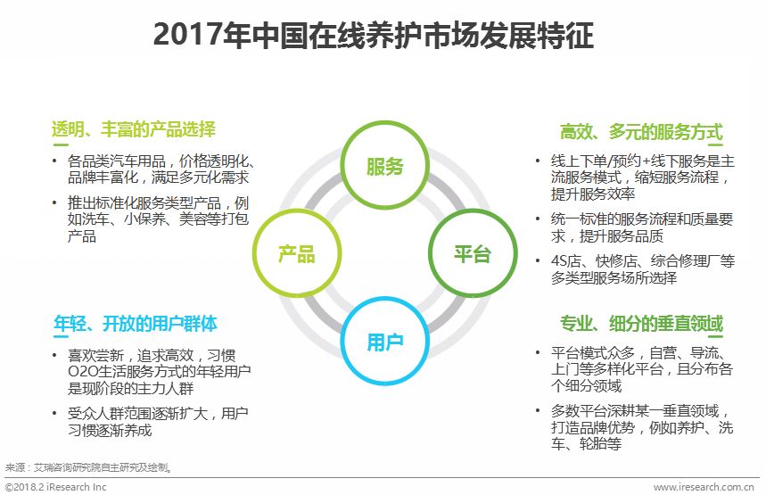中国在线养护市场是后市场中发展相对成熟的市场之一,也是平台模式最为丰富的市场之一。在线养护市场的发展解决了长期以来养护产品价格不透明的用户痛点,不仅提供多品牌产品选择,还将多种服务进行标准化,使市场产品、服务价格更加透明。从服务模式上,线上与线下的深度结合,有效提升了服务的效率与自主性,服务质量也有明显提升。平台模式中,自营型、连锁型、导流型、上门型等多种模式共同发展,满足不同市场需求。现阶段,热爱移动互联网、享受O2O生活方式的年轻人群是在线养护市场的第一批用户,随着品牌知名度的提升,受众人群范围逐渐扩大。