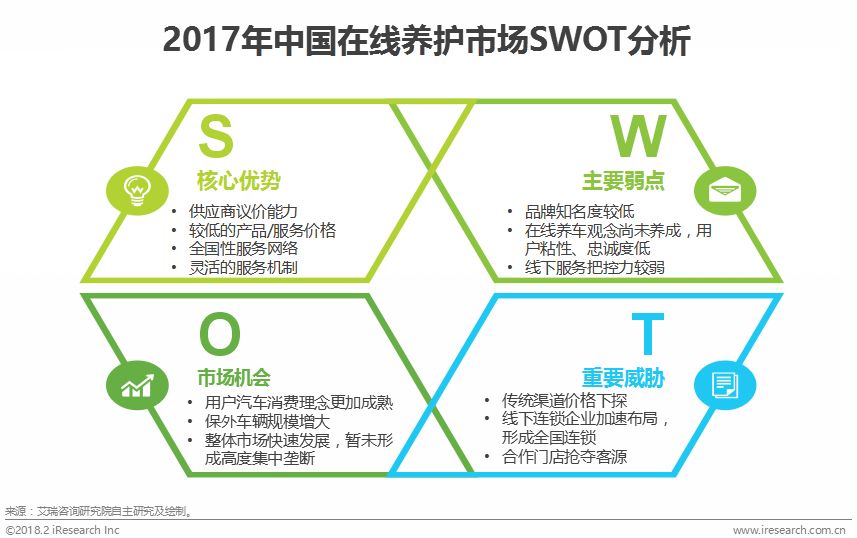 目前,中国汽车后市场在线养护市场核心优势明显,尤其在产品价格、服务效率、线下服务网络三大方面,明显优于传统线下服务体系。但在线养护市场弱点也比较明显,主要在于现阶段在线养护品牌知名度较低,尚未进入多数用户的养护选择范围;另外,价格是吸引用户使用的重要因素,用户的粘性和忠诚度相对较低。随着市场竞争加强,传统渠道也在积极转型,通过调整价格、提升服务等多方式吸引、留住客户。随着用户消费理念更加成熟,市场容量不断加大,在线养护会迎来更好的发展时期。