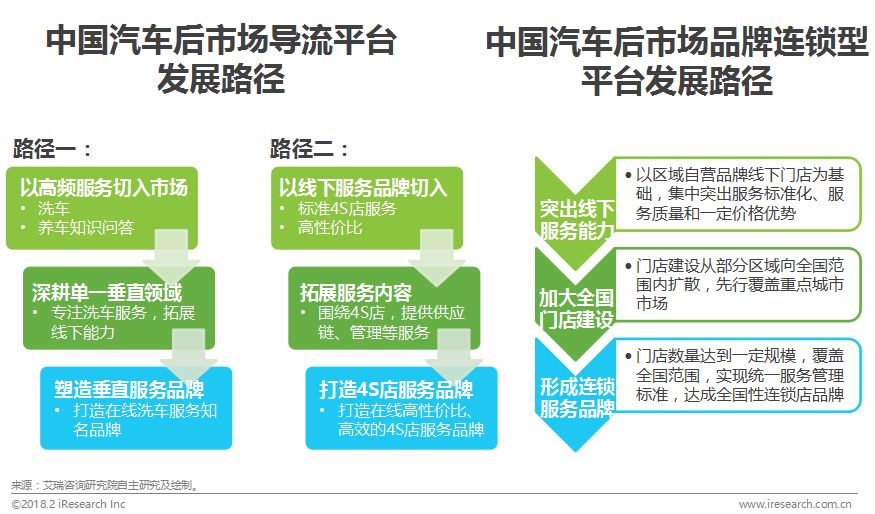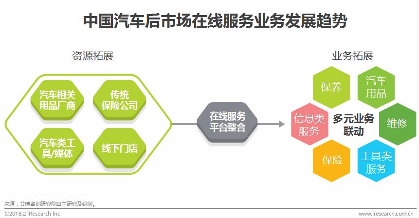 中国汽车后市场产业链较长、业务板块较多,目前绝大多数企业主要从某一垂直领域切入,拓展垂直领域资源与业务。随着移动互联网的发展,汽车用户逐渐尝试并形成通过手机查询汽车信息、查违章、购买汽车相关商品以及汽车保养服务等内容。对于在线服务企业而言,立足自身核心业务,从垂直领域内逐步形成聚合服务平台,进而在垂直领域中树立品牌代表性。然后再横向拓宽上游资源合作,并配合线下资源服务,从而实现覆盖多种服务功能,在平台内容实现业务联动,最终形成汽车后市场在线综合服务平台,增强用户粘性。