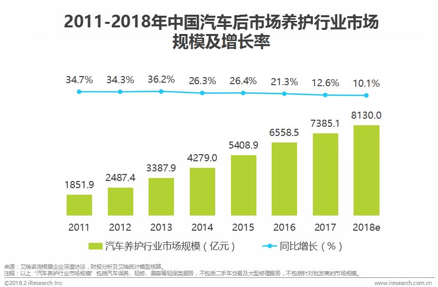 艾瑞数据显示,中国汽车养护行业早已突破了千亿元的市场规模。2017年,中国汽车后市场养护行业突破7000亿元,并保持10%以上增速。 艾瑞分析认为,汽车保有量的持续增长,消费升级刺激豪华品牌市场份额提升,以及汽车美容、车品消费多元化等原因都促进了养护行业保持快速增长。