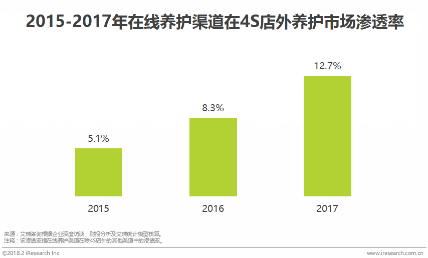 在汽车养护市场中,4S店依然占主体地位,占据过半市场份额;而随着互联网及移动互联网的快速发展、用户消费习惯的改变,在线养护渠道的市场渗透率逐渐扩大,2017年市场渗透率已达12.7%,可见在养护渠道已经成为养护市场重要的组成部分。