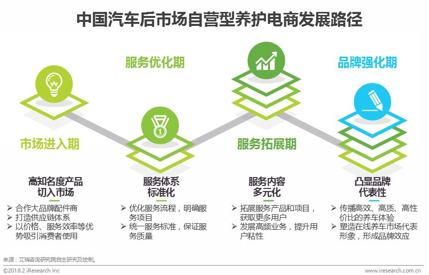 绝大多数自营型在线养护企业,主要以轮胎、机油等高认知度配件为市场切入点,以正品品质保证、高效的物流配送、免费服务安装等方式吸引用户使用;随后,进入服务优化和拓展期, 完成标准化服务体系建设与横向业务拓展等重要布局,进而提升用户的使用粘性与满意度。随着品牌知名度与市场认可度的逐渐提升,深化品牌形象,加强品牌美誉、信任度建设,打造具有行业代表性的品牌。