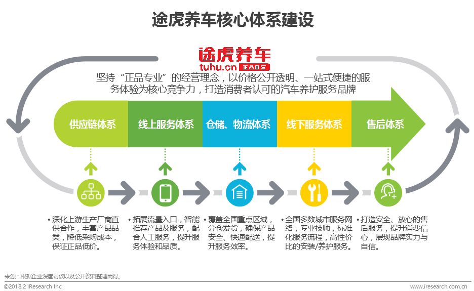 从2011年成立开始,途虎养车始终坚持“正品专业”的经营理念,从供应链、线上服务、仓储物流、线下服务、售后五大体系,不断完善企业服务能力和市场布局。各体系协同作用,缺一不可,向用户市场提供更高品质的养护体验。