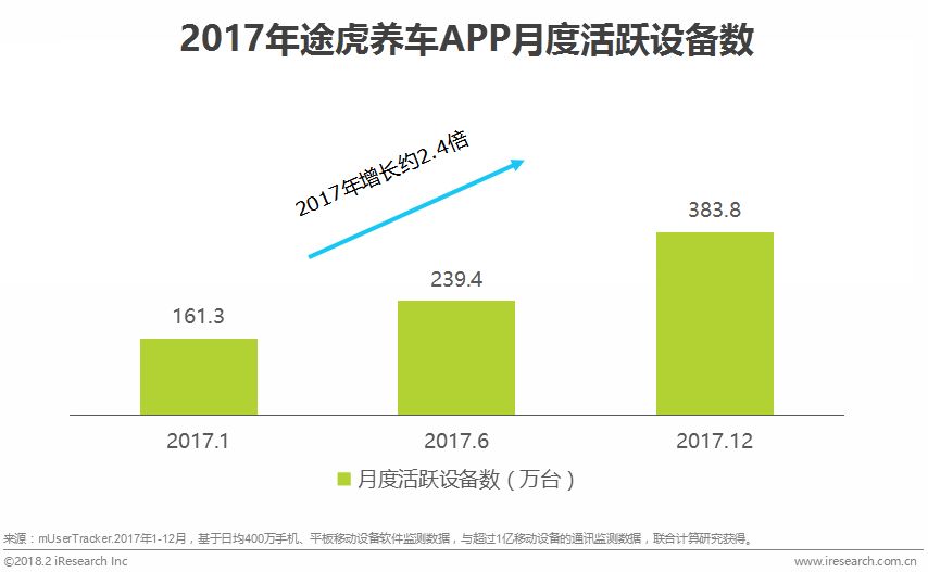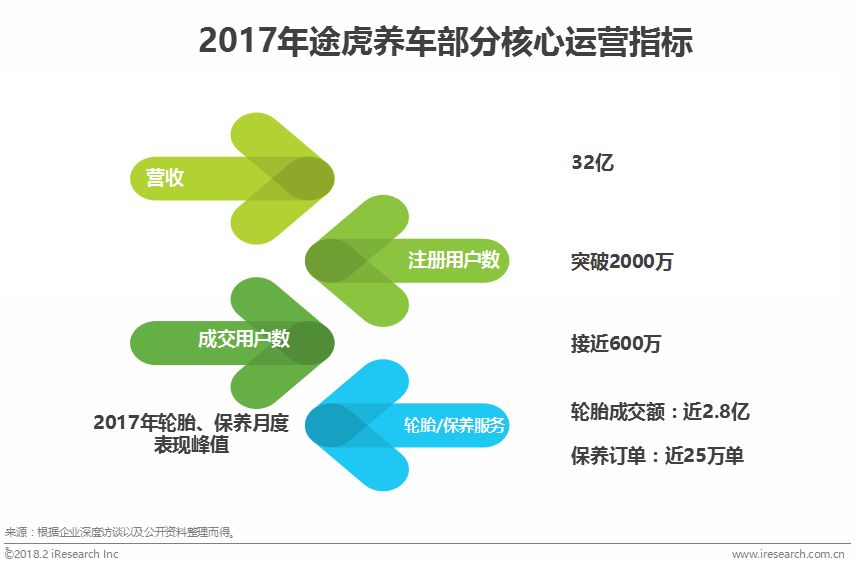 2017年12月,途虎养车APP月度活跃设备数达到383.8万台,较2017年1月增长约2.4倍,在后市场在线养护领域用户规模处于领先地位。可见,途虎养车是目前市场最受欢迎的在线养护品牌之一。另外,从整体营收来看,途虎养车2017年营收达到32亿元,保持快速增长势头。业务方面,轮胎和保养两大优势业务继续保持强势表现,轮胎月度成交峰值接近2.8亿元,保养月度订单量接近25万单。传统核心业务的突出表现,尤其作为业务体量和活跃用户规模已经处于较高水平的成熟企业,可见在后市场养护领域品牌影响力十分强劲。
