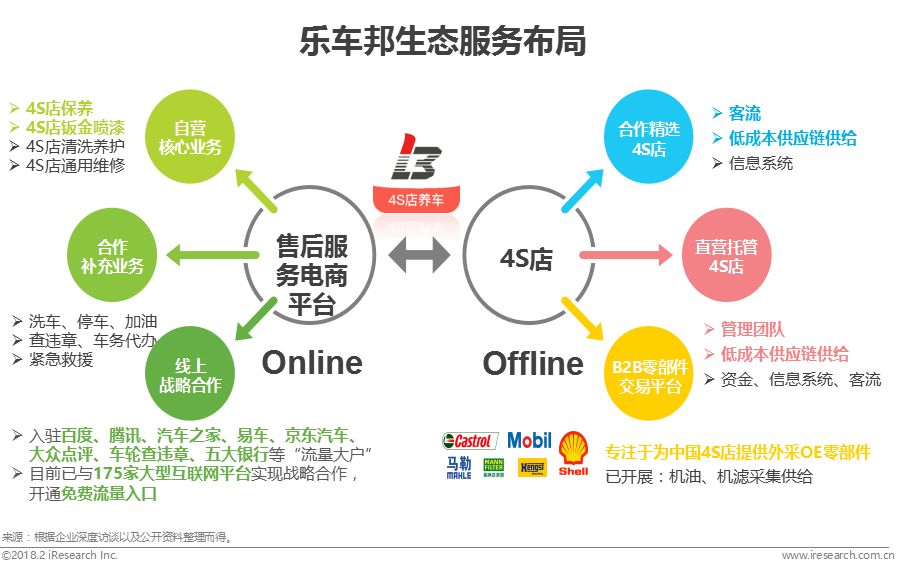 乐车邦以整合4S店闲置资源,为用户提供最高性价比、标准化、原厂品质的汽车售后服务产品为切入口,打造用户用车一站式服务平台。由此同时,通过深度优化行业资源和业务创新,启动4S店托管业务和B2B零部件交易平台,实现业务板块联动发展,基于4S店网络的O2O生态闭环初步成型。