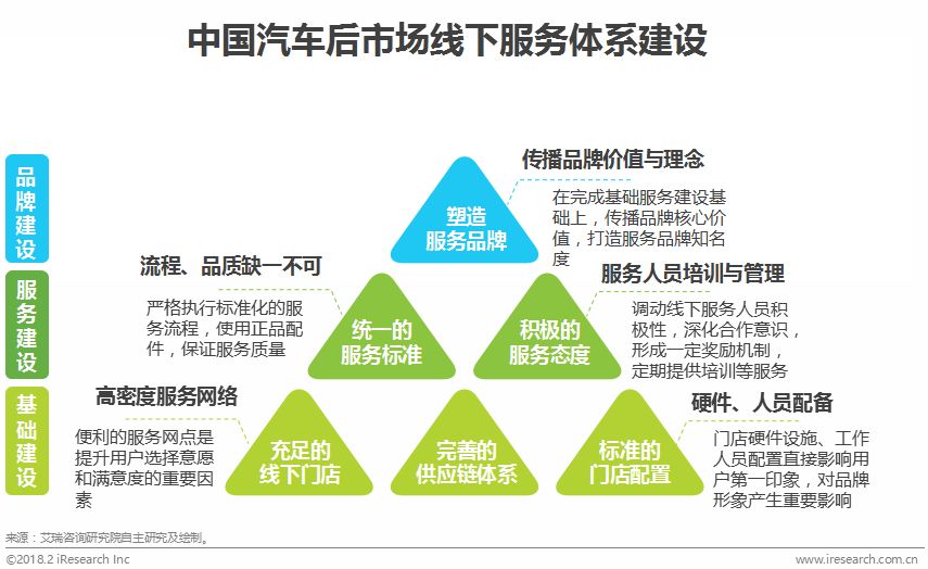 汽车后市场众多垂直领域非常依赖线下服务能力,尤其在汽车养护市场中,线下服务能力决定整体服务效率和品质,对用户选择和体验有重要影响。同时,新零售概念与模式正快速发展,更加重视线上服务、线下体验以及现代物流的深度结合。可见,对于传统在线服务而言,线下服务能力显得更为重要。目前,中国汽车后市场线下服务体系建设主要包括三大部分:基础建设、服务建设与品牌建设,三个部分紧密相连,缺一不可。其中基础建设需要强大的资金与地推团队支持,服务建设需要良好合作、奖惩机制,只有较好的完成基础建设与服务建设,才能实现良好的服务品牌。