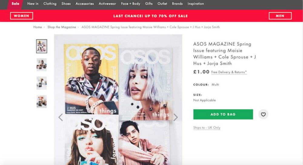 据英国媒体PressGazette报道,近日为庆祝旗下时尚杂志《ASOS Magazine》第100期发行,英国时尚电商 ASOS 宣布将首次在官方网站售卖该杂志,每本售价一英镑。这本按季度发行的杂志原本是ASOS作为礼品对其忠实会员的免费奖励。