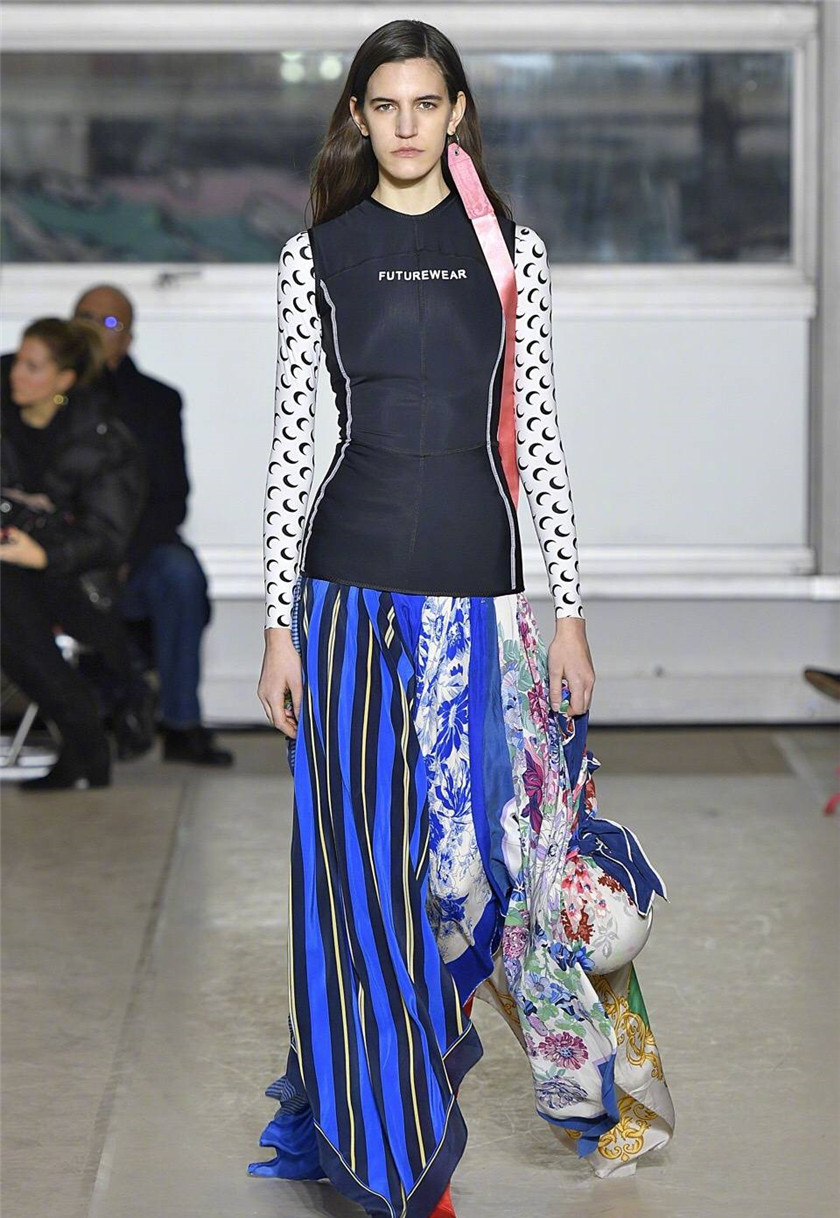 而去年LVMH设计师奖得主Marine Serre在2018的秋冬系列中,用一件黑色的紧身衣搭配了一款蓝色拼接条纹裙,这种令人意外的搭配风格反倒并没有什么太过违和的地方。