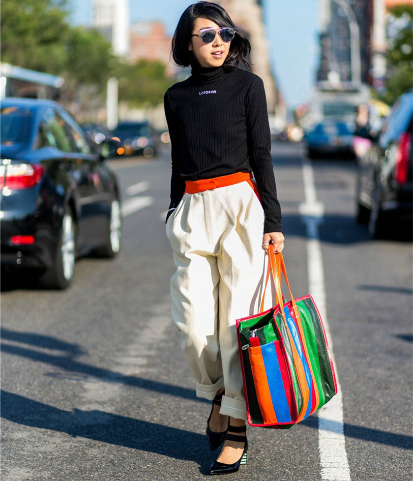 作为气质服装元素的一种,很多人在选择条纹服装的时候都更倾向于套装的搭配。其实不然,素色上衣搭配彩色条纹阔腿裤也能穿的很好看。比如,短发的刘诗诗在Tory Burch 2018秋冬大秀现场就用浅驼色的羊毛衫搭配了一条橙黄色为主的彩色条纹长裤。配色大胆又不失质感,保暖效果也很好,很适合初秋季节。