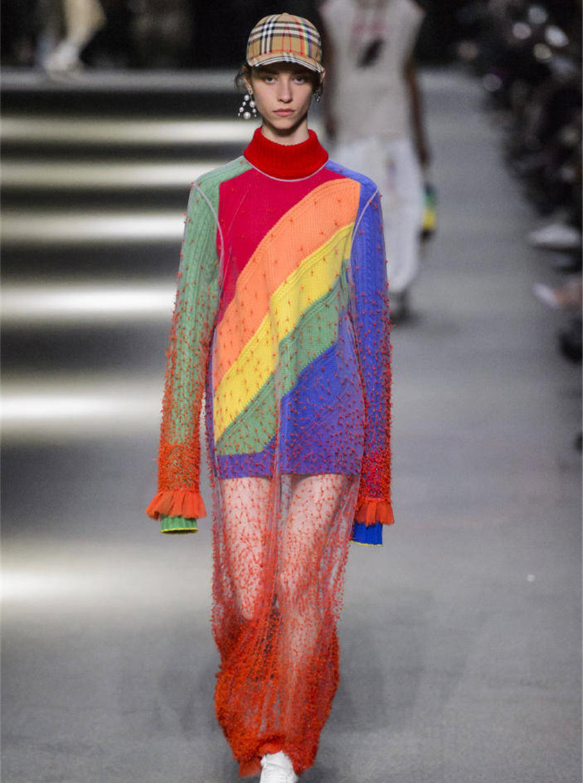 在样式上,2018秋季秀场上的彩色条纹并不仅仅局限于横竖的样式,比如说Burberry在Christopher Bailey指导的的最后一个系列上,以彩虹为主题,把七色的斜条纹加入到了裙子的设计中。
