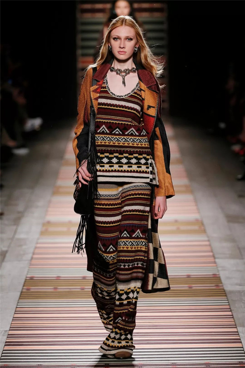 而另一种比较抢眼的条纹风格则出现在了Etro 2018的秋冬秀场——部落条纹。以大片深棕色为底色,加上带有原始风格的神秘图案,特别适合旅行穿着,拍出来的照片也非常好看。