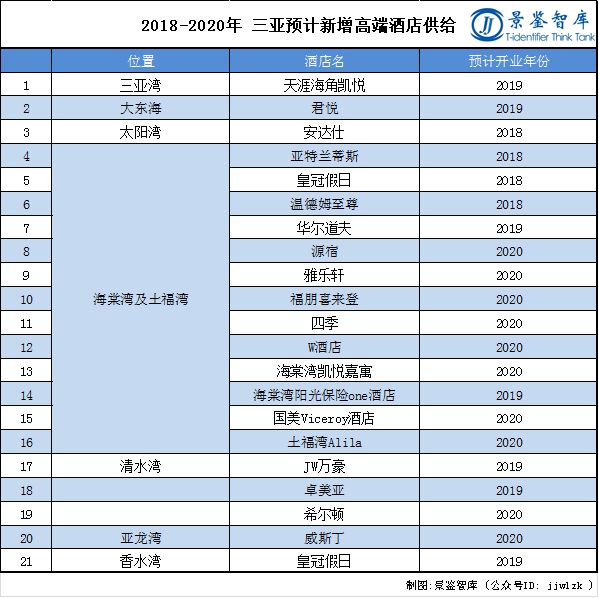 如果仅仅把亚特兰蒂斯看作是一个走极致高端路线的七星级酒店,那只是看到一个表象。三亚作为中国最热点的旅游城市之一,高端酒店或许是其最不缺的旅游产品。各个海湾一溜的高星级酒店和配套房地产,一个比一个更高端、更奢华。去年就有号称七星级的海棠湾红树林酒店开业,相信今后号称七星的超星级酒店也不会止步于此,所以单纯的高端酒店很容易陷入同质化竞争中去。据景鉴智库不完全统计,仅2018-2020年三亚预计开业的五星级或超五星酒店就有21家。(如下图)