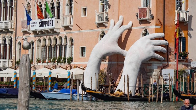 意大利艺术家 Lorenzo Quinn为2017威尼斯双年展创作了一件令人震撼的雕塑作品——这双大手从威尼斯大运河中托起,支撑着古老房子的一角,呼吁人们对为时迫在眉睫甚至威胁到威尼斯城存在的全球变暖问题引起重视、采取措施。Quinn 以作品中呈现的人体元素著称,上海现代艺术博物馆也藏有他的另一个平衡杰作。