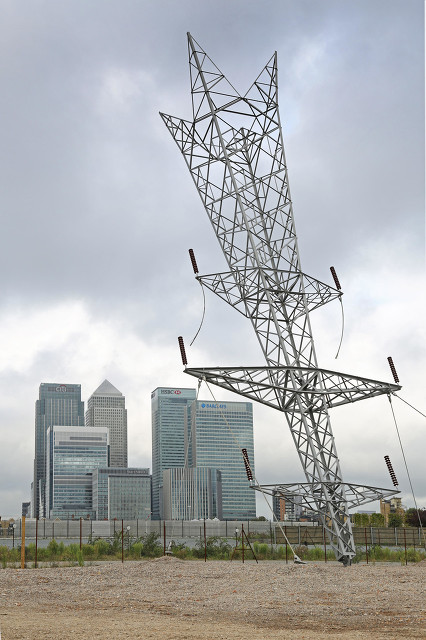 英国雕塑家Alex Chinneck在伦敦设计节的参展作品,展示了一个惊艳的里程碑式的电子信号塔,倒插在地上。位于格林威治半岛,号称“一颗流星子弹”,以一个不稳定的角度倾斜,看起来好像已经被射入地球。