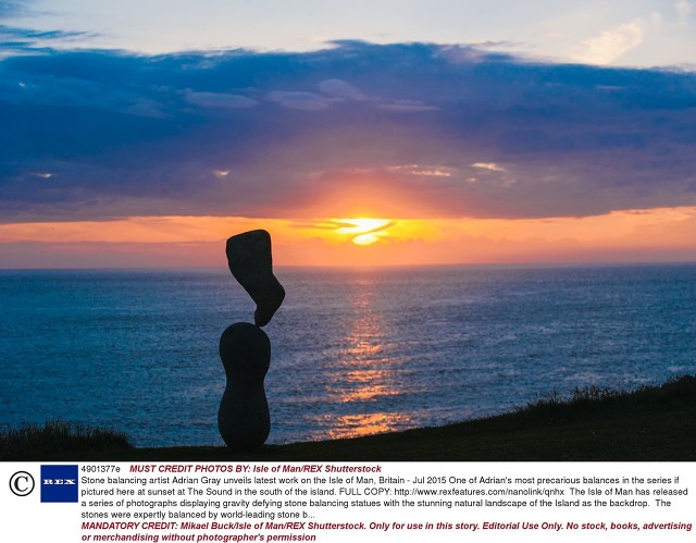 石头平衡艺术家Adrian Grey在2015年7月剪彩公开了他在英国马恩岛最新作品,来自各种自然环境中的灵感,结合了小岛上叹为观止的自然景观,寻找完美的岩石和位置来平衡着、实体化着自己的无敌脑洞。
