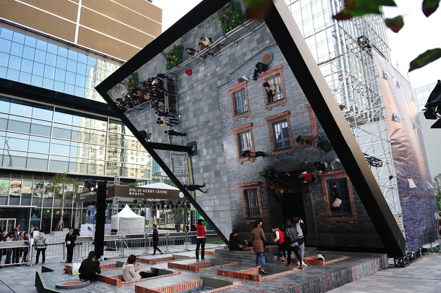 这件可以参与的艺术品,于2013年11月19日在上海静安嘉里中心落成,由知名阿根廷装置艺术家Leandro Erlich设计而成,变成了人人都可以玩特技的神奇之地。透过上海石库门,利用镜子的反射,使参观者走入装置进行空间互动,再由大斜向玻璃倒影,进入装置的人会发现自己于石库门飞檐走壁。