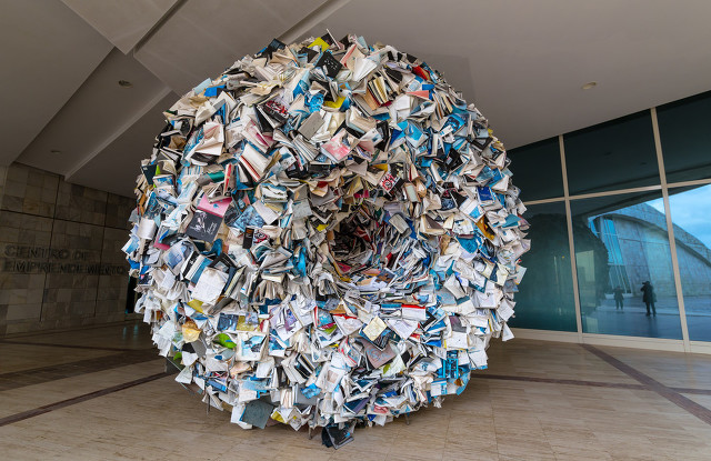 设计师Alicia Martin是个“文化人”,她的2014年1月5日将一系列富有艺术感、挑战平衡杆的图书堆雕塑献给了圣地亚哥德孔波斯特拉市。最奇葩的一个雕塑是在图书馆的窗外,一大堆书倾泻而下一直到地板上,观赏者大呼仿佛“哈利波特的魔法”,也很想考完了高考的高三生的举动。