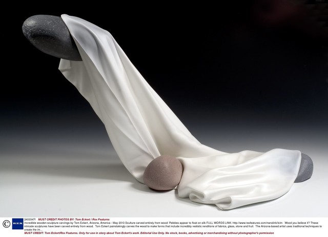 2013年5月,设计师Tom Eckert在美国亚利桑那州展出了他的微型奇迹。你敢相信这些复杂的雕塑,完全是由木头雕刻而成的吗?这位设计师的手中,织物、玻璃、石头和水果无非是需要超现实处理的死物,只有最终呈现的小奇迹才是鲜活有力量的,是一场幻觉盛宴。