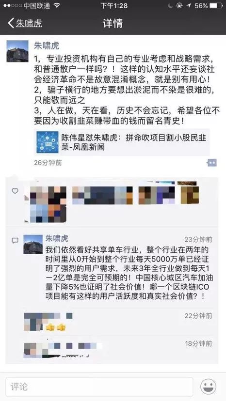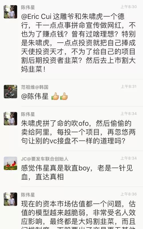 激战的高峰,出现在陈伟星贬损朱啸虎,称后者拼命鼓吹项目(剑指ofo),然后让别的VC接盘,通过名人效应割普通VC和小股民的韭菜。这句应该是激怒了朱啸虎,他回击:“专业投资机构有自己的专业考虑和战略需要,这样的认知水平还妄谈社会经济革命,不是故意混淆概念,就是别有用心!”