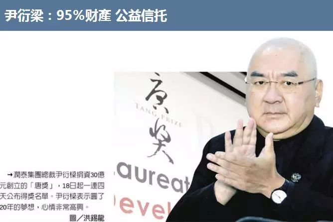 尹衍梁给出的理由很简单:留太多钱会害了子孙。而此前,他捐资30亿新台币,在台湾创立了“唐奖”, 主要资助对象为中国文化发展项目、中国和台湾的大学文史研究;生物科技和新药的研究;以及环保事业和绿能產业的发展。