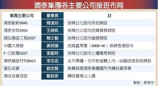 目前,许多台湾家族企业集团纷纷进入“高龄化”状态,代际传承势必是一项严肃且极其重要的大事。润泰旗下,至少有6家上市公司,子孙公司及参股的企业更是星罗密布,由谁来接班,又如何布局,自然使人瞩目。