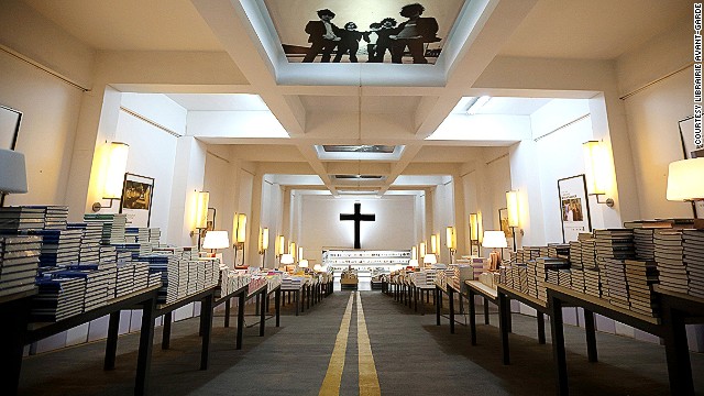 这个占地4000平方米的书店,有着与众不同的装饰,例如巨型的十字架,罗丹《思想者》的仿制雕塑,以及用上千本旧书做成的收银台。书店里为读者准备了300张椅子,这里也可以算是个公共图书馆。