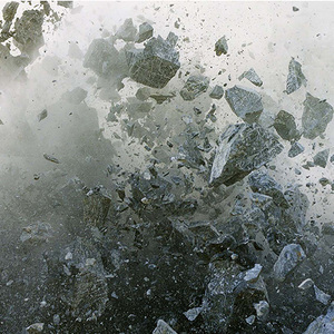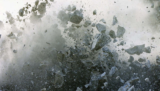 比如,拍摄矿场爆破,畠山直哉会捕捉到爆炸的一瞬间,只需按一下按钮,历经数百万年形成的坚硬岩石就这样土崩瓦解了。石灰岩被炸成一股风沙,倾泻而下,巨石间升起一股股白烟。在畠山直哉眼里,这就是建筑成型的开始。从石灰岩身上,他看到了大地的过去和城市的未来。矿场上的爆炸既意味着毁灭,也孕育着新生。“爆破专家向我形容他们在爆破那一瞬间的激动之情,” 畠山直哉写道,“让我想起了农民用锄头翻开地面时的感觉。” 遍布矿坑的采石场并不预示着大地即将迎来末日,但其以自己的方式显得格外庄严肃穆:斜槽、传送带、钢架起伏交错,好像暗藏一种模糊的希望。