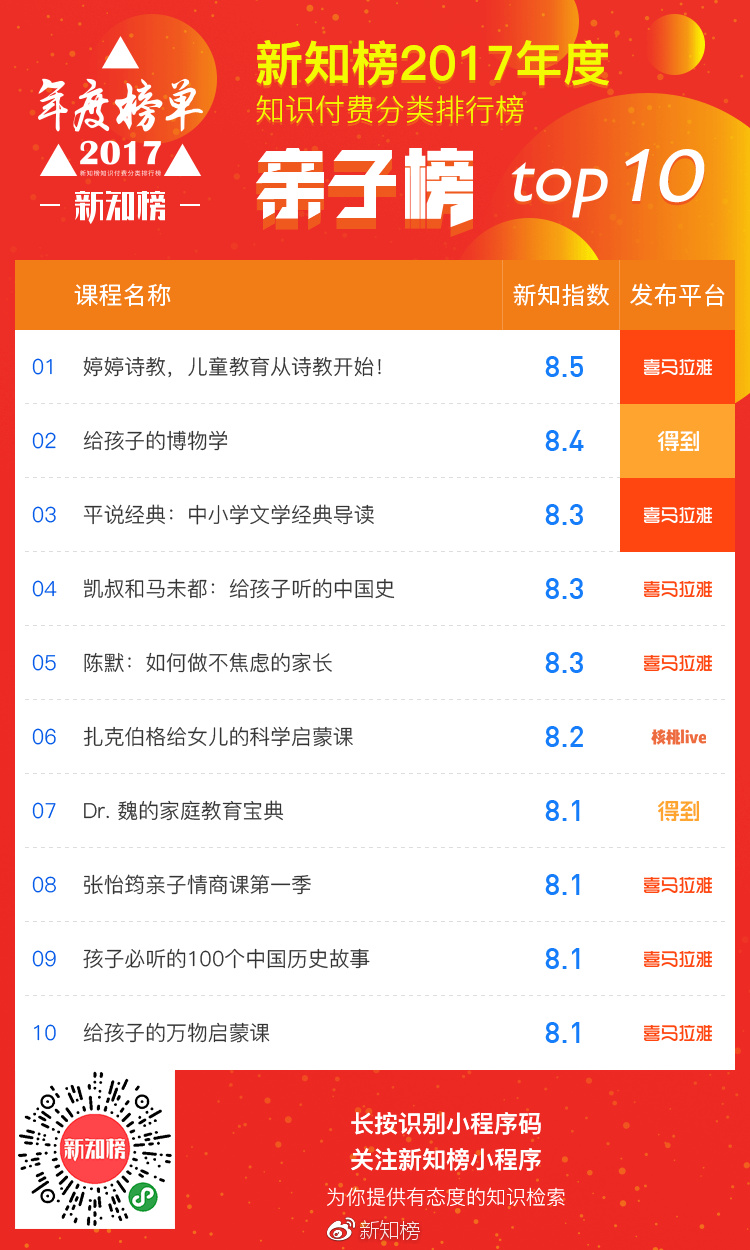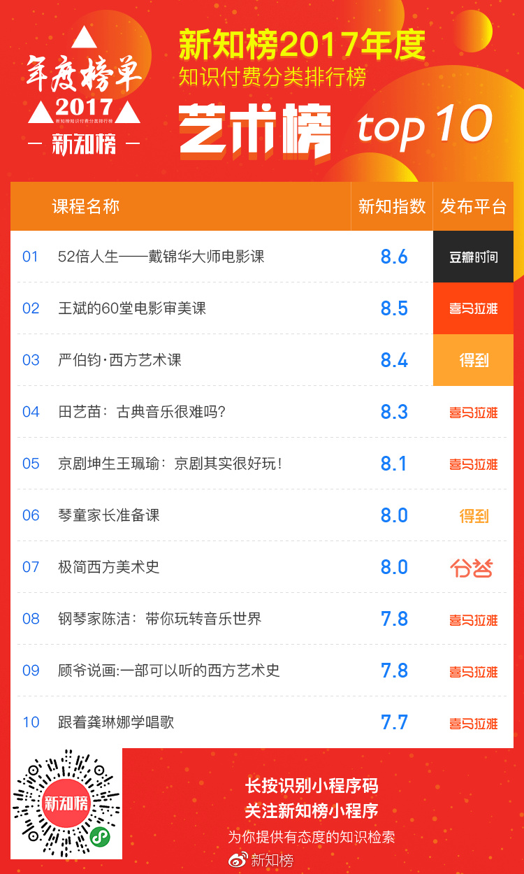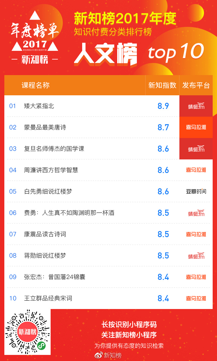 该榜单以新知指数为依据,评选出财经、商业、成长、人文、艺术等10个分类最值得推荐的10大精品课程,2月23日,我们发布了2017年度新知榜知识付费分类排行榜(上)”,今天,我们正式发布“2017年度新知榜知识付费分类排行榜(下)”,为你揭开人文、艺术、亲子、健康、两性5大分类的TOP10精品课程面纱。
