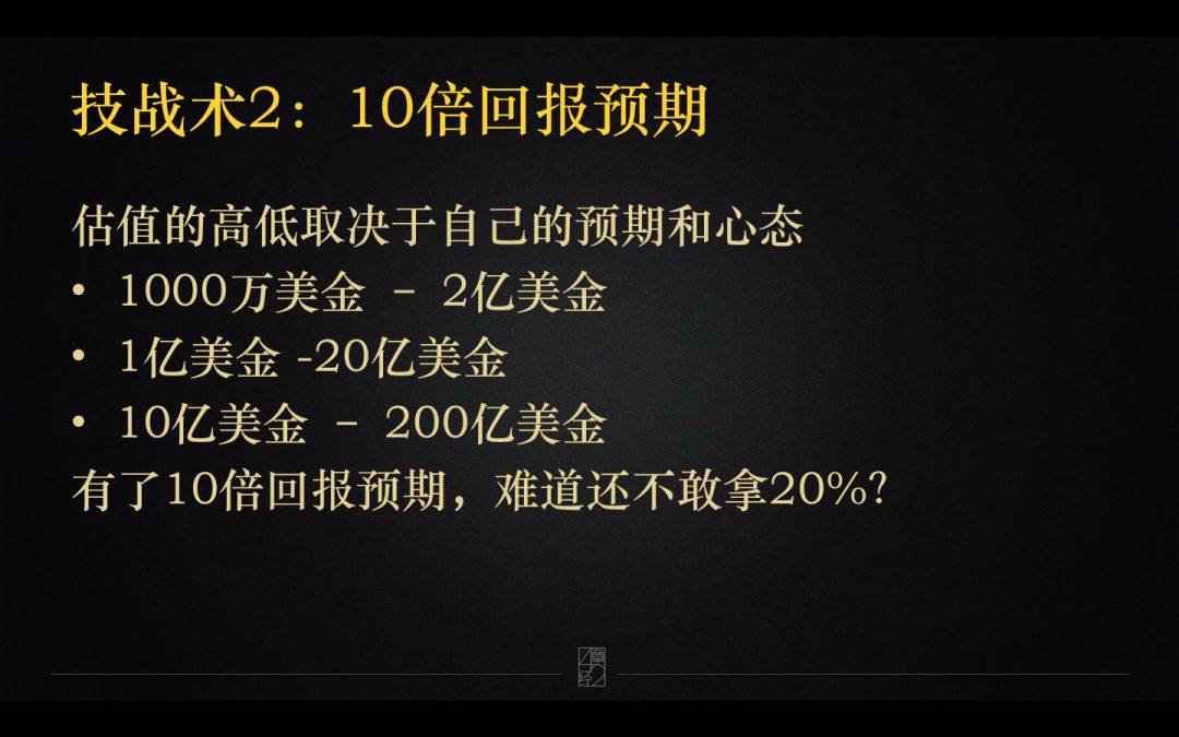 第二个技战术就是一定要有 10 倍回报的心态。我们以前总是把做 VC 的人分阶段,我是投天使的,我是投 A 轮的,我是投 PE 的等等,好像天使就应该赚倍数多,PE 总是倍数赚不多。但是在现在资本集中的情况下,尤其是大家开始把钱都涌向头部公司的时候,你会发现后期的项目资本集中或者提升的速度甚至会比早期项目还要快。