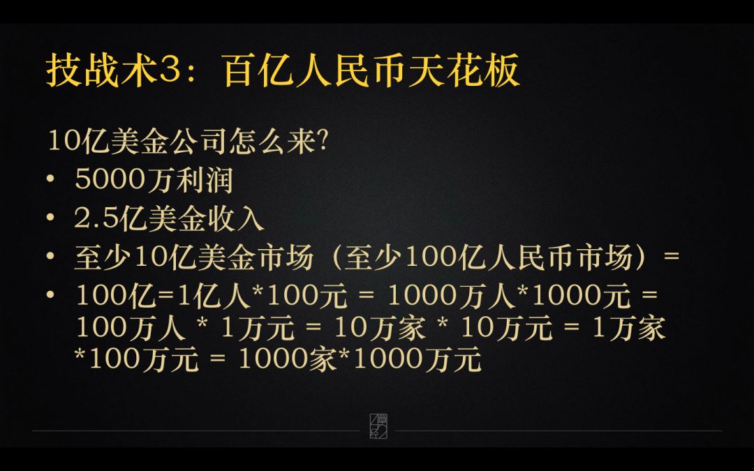 至少 10 亿美金市场(至少 100 亿人民币市场)=1亿人*100元 = 1000万人*1000元 = 100万人 * 1万元 = 10万家 * 10万元 = 1万家*100万元 = 1000家*1000万元
