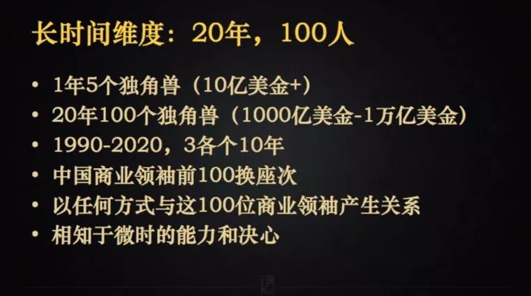 这个基本假设就是——未来中国每年一定会出现至少 5 个独角兽(10 亿美金以上的公司)。那么未来 20 年,这 100 个人或者 100 家公司就会定义下一代的福布斯榜单,中国商业领袖前 100 就会换座次。所以 VC 的工作就是一定要在这 20 年当中,和这 100 个人产生任何关系。你可以等他 20 年后上市了,通过买股票去跟它产生一种弱联系;你也可以在他完全没有创业的时候,作为他的家人朋友支持他一把;但 VC 是通过专业的方式去和未来榜单前 100 的人产生关系的一种方式,并且有机会、有能力相知于微时。这个是做 VC 真正的信念来源。