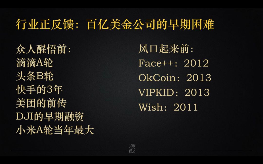 另一方面是关于风口。谈到人工智能,其实 face++ 我们在2012年就见过了;OKcoin 比特币,现在应该是世界上最大的比特币交易所之一,但 2013 年这个公司就融了 A 轮;VIPKID 是今年在线教育的大热点,但雯娟 2013 年就在创新工场的办公室里办公了;再比如,前几年“把中国模式复制到海外”很热,但 Wish 在 2011 年就是个接近百亿的公司了。所以在风口起来前的 3 到 4 年,甚至是 4 到 5 年,这些公司就已经融到了他们的第一笔钱。这说明真正优秀的 VC 在那个时候就找到了这些公司。