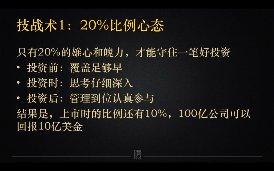 这个心态很关键,只有拿 20% 的雄心和魄力,才能守住一笔好投资。这样你就不会用一个只拿 5% 的心态去看,不会说我就随便跟点吧。“加塞跟一点”这样的行为会造成你的判断下降,因为你已经不靠独立思维去看了,这会导致你在投资前就缺乏思考,导致你在投资谈判的过程中也无法清楚地意识到资金的定位和资源价值到底是什么,还会导致你最后的投后管理松散,甚至管都管不过来。即使这个项目成功了,如果你只占个 1%,根本就等于白做,创始人跟你的关系也会特别疏远。但如果一个上市公司做到百亿美金,如果我占 10%,其实我就能赚到 10 亿美金,就会成为我上面关于 VC 分类里所谓的 top VC。