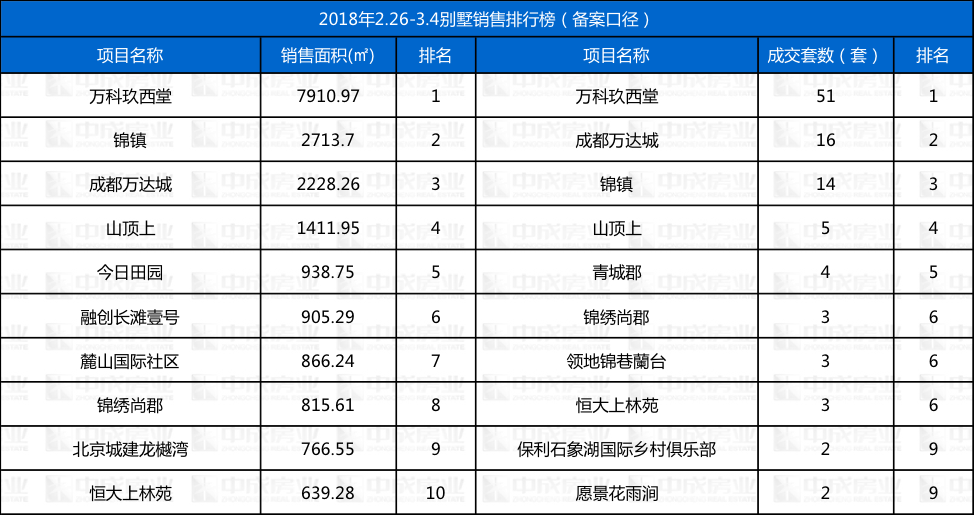 本周别墅市场成交排行来源:成都中成房业