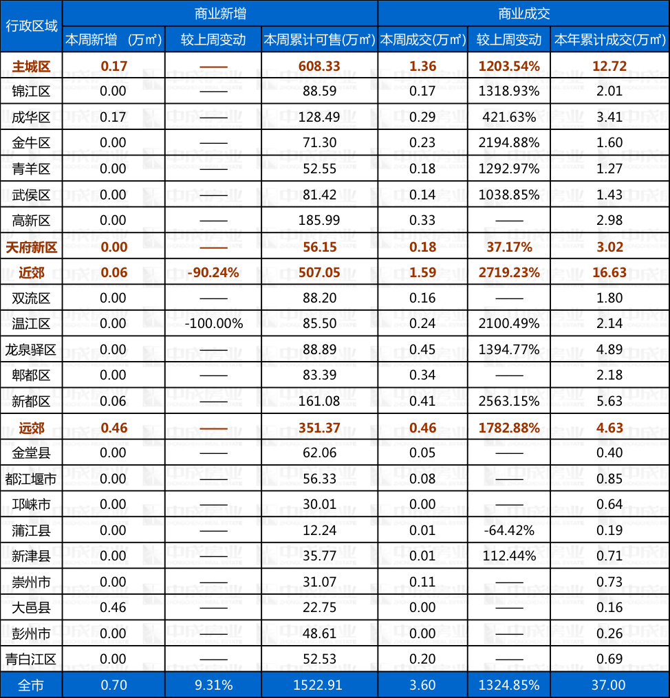 本周商业市场供销来源:成都中成房业