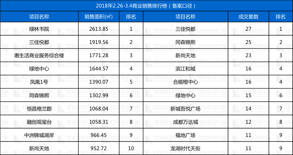 本周商业成交排行 来源:成都中成房业