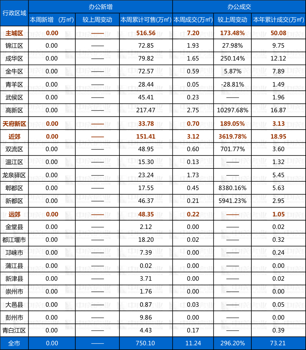 本周大成都办公无新增供应,成交11.24万㎡,环比上升296.20%。
