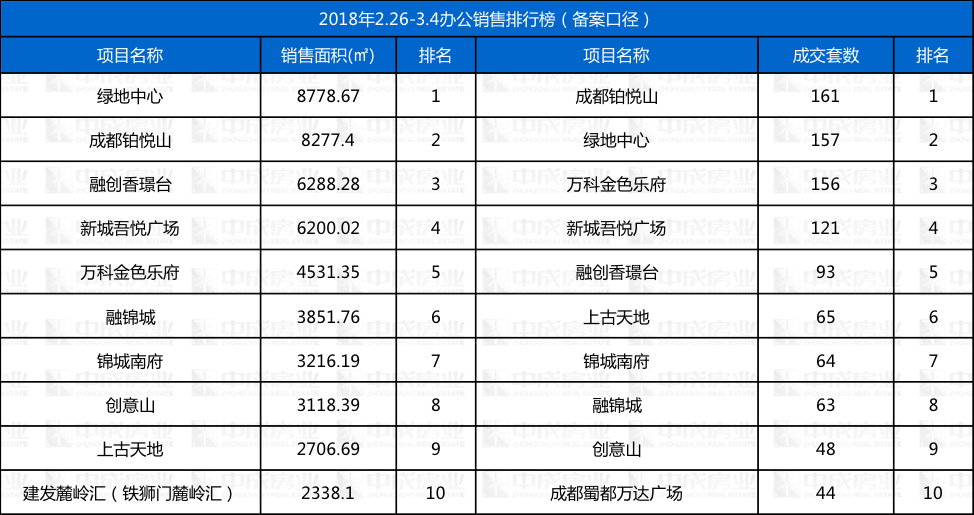 办公市场成交排行榜来源:成都中成房业