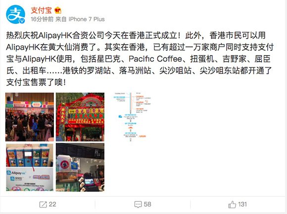 支付宝官方微博表示:庆祝AlipayHK合资公司今天在香港正式成立。此外,香港市民可以用AlipayHK在黄大仙消费了。支付宝方面表示,在香港,已有超过一万家商户同时支持支付宝与AlipayHK使用,包括星巴克、Pacific Coffee、扭蛋机、吉野家、屈臣氏、出租车……港铁的罗湖站、落马洲站、尖沙咀站、尖沙咀东站都开通了支付宝售票。