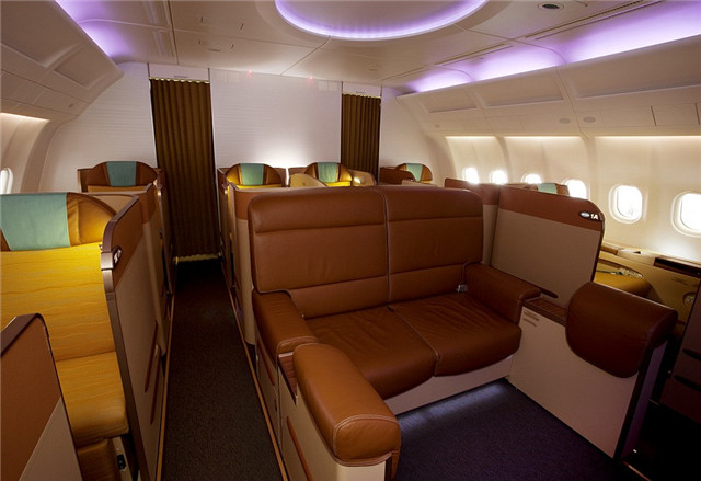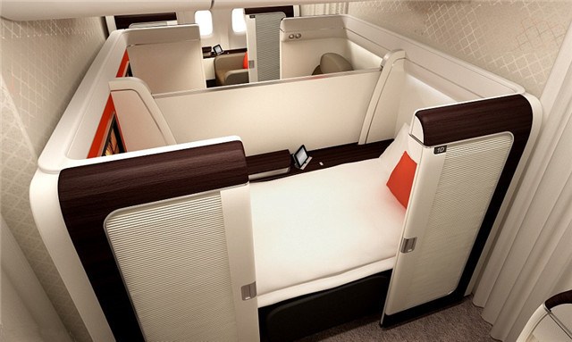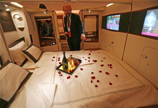 最赞的头等舱:新加坡航空公司空客A380头等舱里的双人床,还会为客人提供2004香槟王。