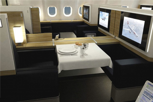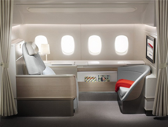 阿联酋阿提哈德航空的头等舱“The Residence”将于12月投入使用,到时将会给乘客提供空中酒吧、设备齐全的三人间、意大利定制的高级皮革沙发、两个餐桌、飞机管家,还会专门提供私人司机为每位乘客办理登机手续和行李托运,除此之外,飞机上还会有私人主厨为乘客提供各种想吃的美食。
