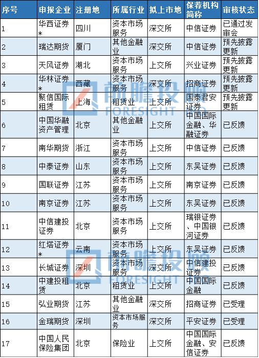 正常审核状态中的分别是华西证券、天风证券、华林证券、中泰证券、国联证券、南京证券、中信建投证券、红塔证券*、长城证券。
