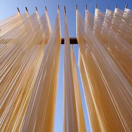 晒干后的挂面,利于贮存,每根直径1毫米左右。持续发酵产生中空的细孔,使面条口感细腻绵软。