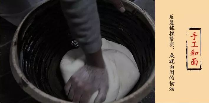 随后进行搓面盘面。因为人的力量有限,一次最多只能和面35kg左右。将面搓匀,保证将近70斤的面团里没有一点生面粉,这毫无技巧,全靠一双手的功夫。