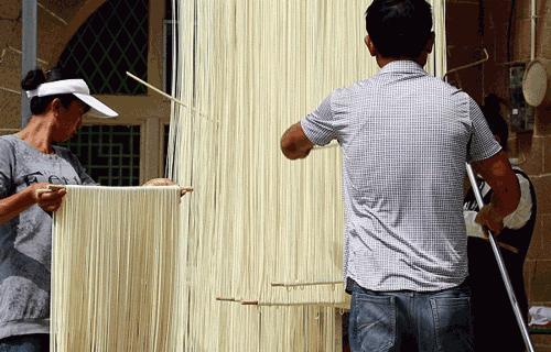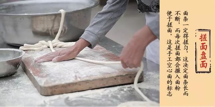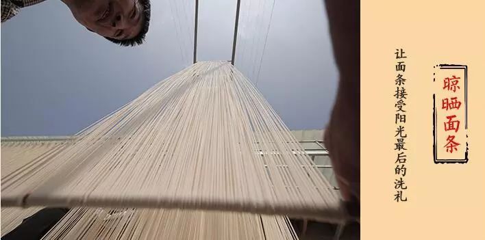要做出一份地道的手工空心挂面,需要一个熟练的师傅近20个小时的工作量,经过13道工序,光是发酵面团就要反复做三次,最后要将每根面条拉伸至3米长,挂在阳光下,风干成型。