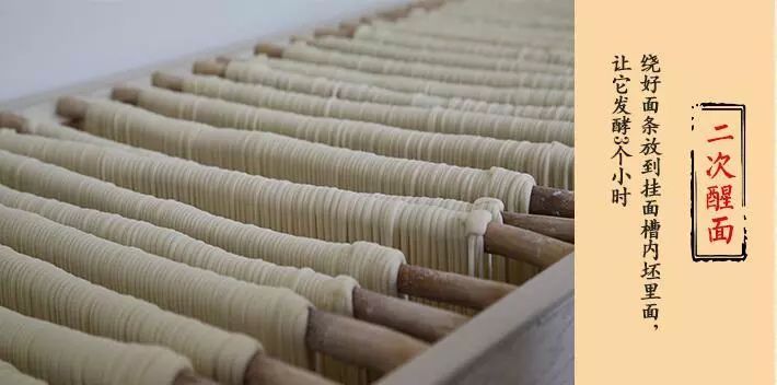 把绕好的面条放入专门的槽中进行第二次醒面,这一次是空气水分和面粉充分融合凝聚的关键步骤,面条需充分发酵3小时才能达到挂面要求的弹性和拉伸度。