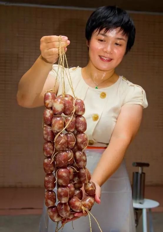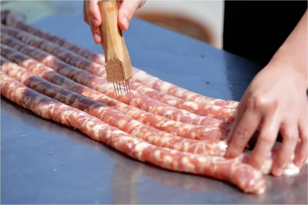 保留手工灌肠的做法,依据天然肠衣的粗幼薄厚,调整灌肠的松紧程度。