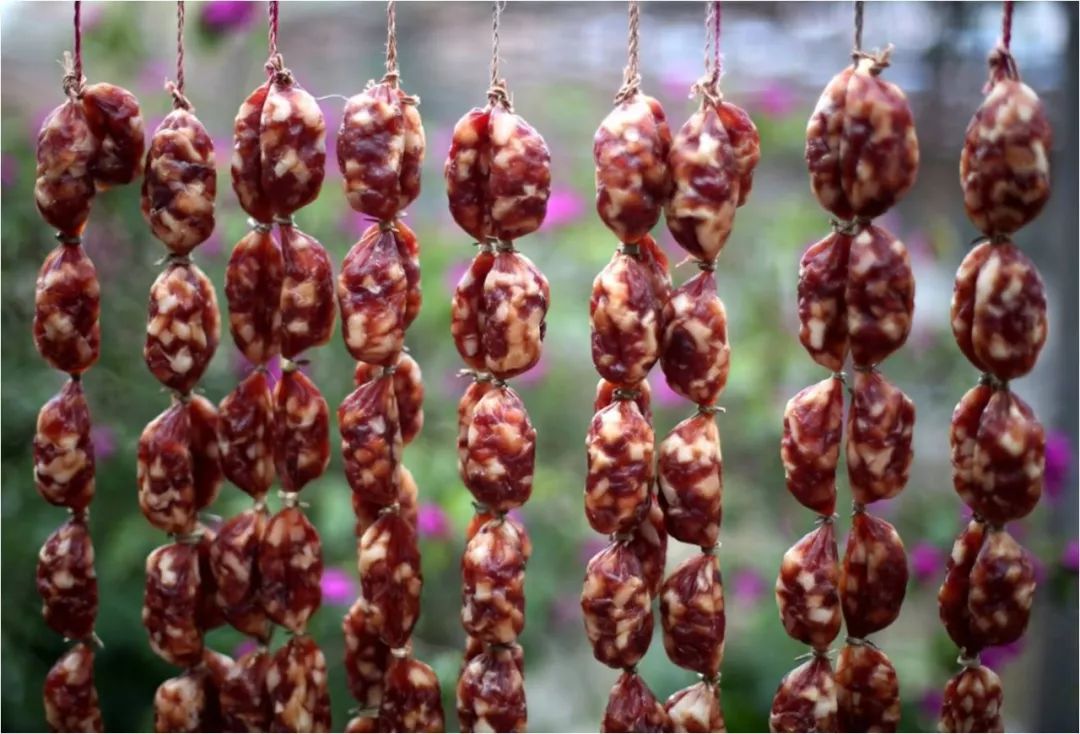 传统的腊肠制作都需要悬挂暴晒,自然风干至适度,去掉水分而成干制品。