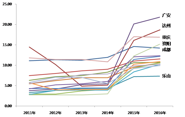 注:因行政区划调整扩大,达州市2012-2013年指标数据出现较大幅度回落