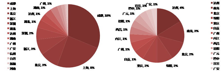 两者的外地客户组成结构截然不同,重庆购房客户中有10%来自成都,另外来自上海、北京、浙江省的客户分别占比达到8%、3%和3%,从外地客户的来源地可以看出到重庆购房的外地客户主要来自经济更发达区域,来自周边三四线城市的客户较少;而成都的外地客户来源地相对较更加分散,主要来自周边城市,如达州、南充、绵阳、自贡等省内城市,这部分外地客户的主要都是从三四线城市进入成都工作生活、未来将成为“新成都人”的客户,更多的需求为自住型需求。